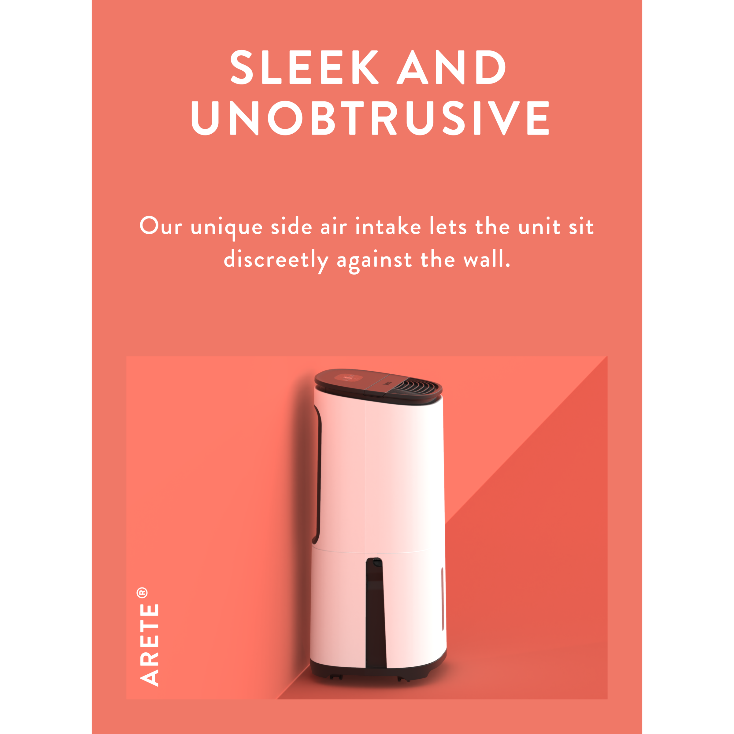 Customers tell us that they never put their dehumidifiers away. In fact, they stay in the same area of the home all year round. So we have designed Arete to be stylish so that it looks great wherever you put it. It sits flush to the wall, has hidden castors and an air purification mode means you can use it all year round too.
